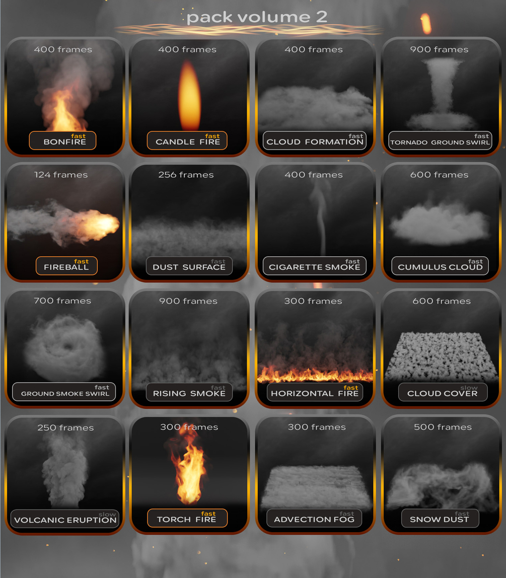 For all packs applies: There are fundamentelly different VDB sequences and cover many uses. Smoke, fire, clouds or fog. In a faster or in a slower time range. Below you can see which vdb loops are included in which package