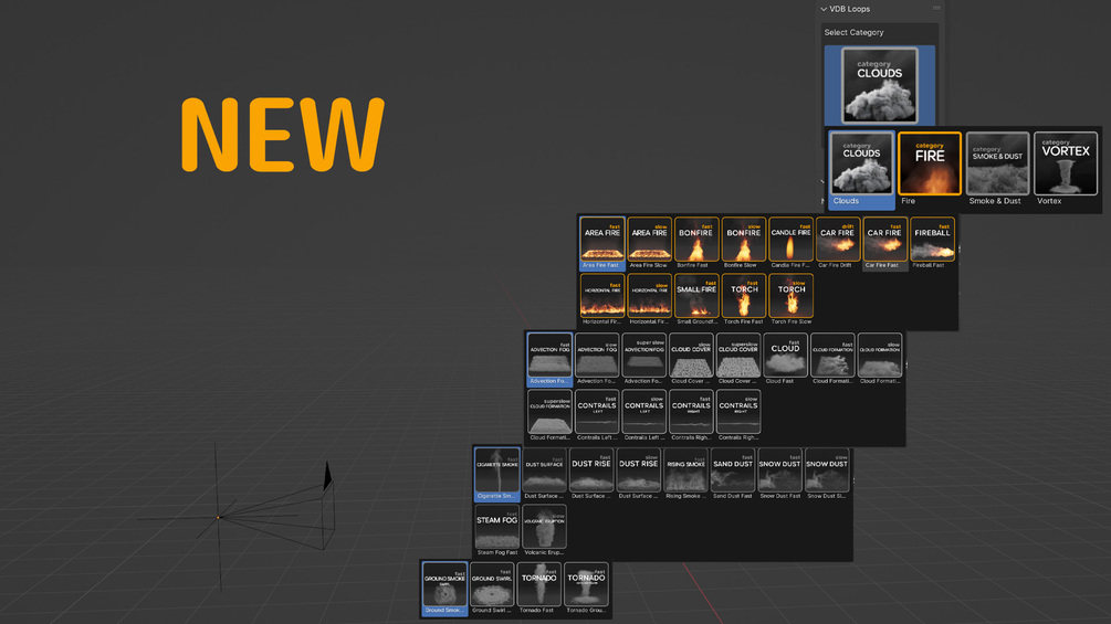 The addon comes with 8 different VDB loops arranged and categorised in the designated element pack.